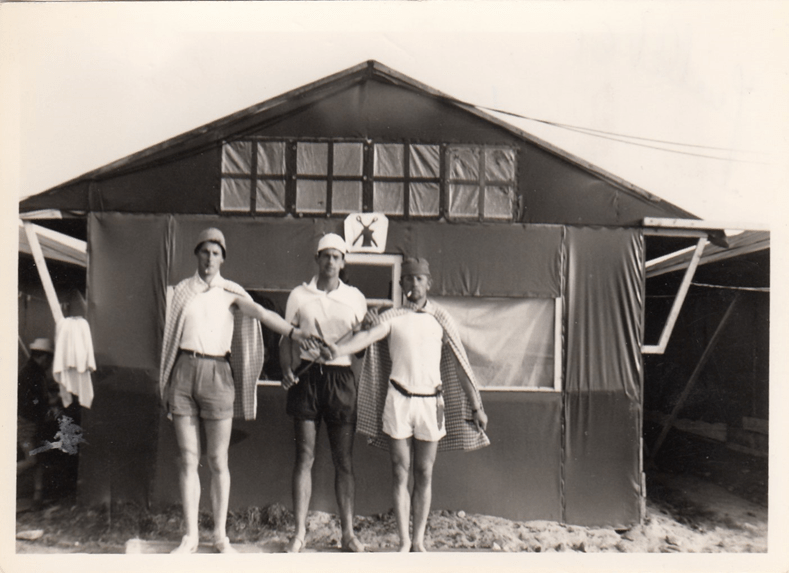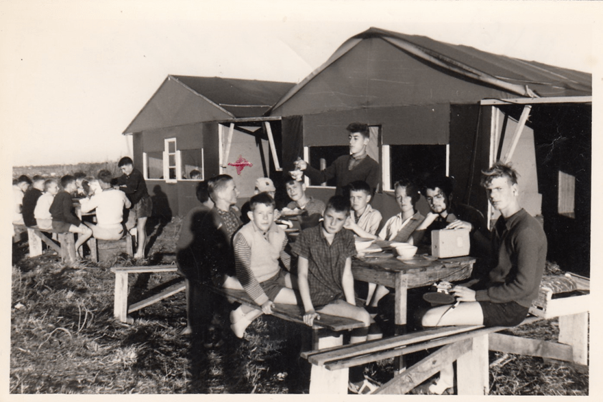 Juillet 1961: Pendant 4 semaines sur le plateau face à l’îlot Saint-Michel, lieu sauvage situé près du camping des Hautes Grées actuel (qui n’existait pas à l’époque), environ 90 enfants, moniteurs et personnel d’infirmerie, de cuisine et de lingerie campaient sous des marabouts et bungalows en bois et toile. Les matelas étaient directement posés par terre, sur une toile recouvrant une couche de sable de mer. Il avait été promis à Monsieur l’abbé que tout le matériel devait être à la disposition des colons (lits, tables, etc…) mais les promesses non pas été tenues. Les toilettes se trouvaient dans un ancien blockhaus. Une tempête mémorable a détruit marabouts et un bungalow… inoubliables souvenirs.