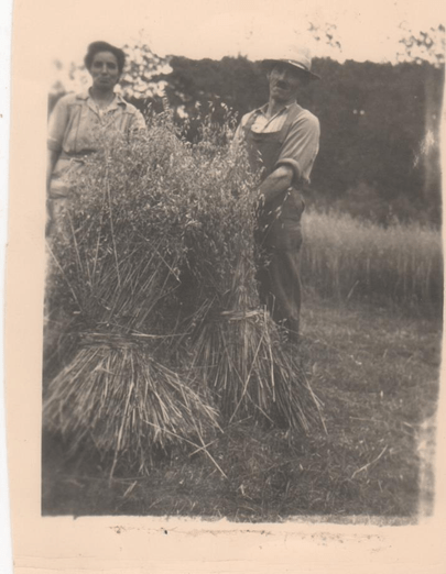 Mes parents, Suzanne et Jean Barbedienne, à côté d’une tourelle de gerbes d’avoine.